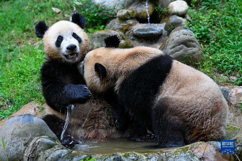 8月18日,中國大熊貓保護研究中心都江堰基地的大熊貓在圈舍的水池里戲水玩耍。