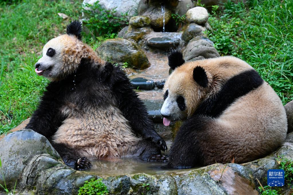 8月18日,中國大熊貓保護研究中心都江堰基地的大熊貓在圈舍的水池里戲水玩耍。