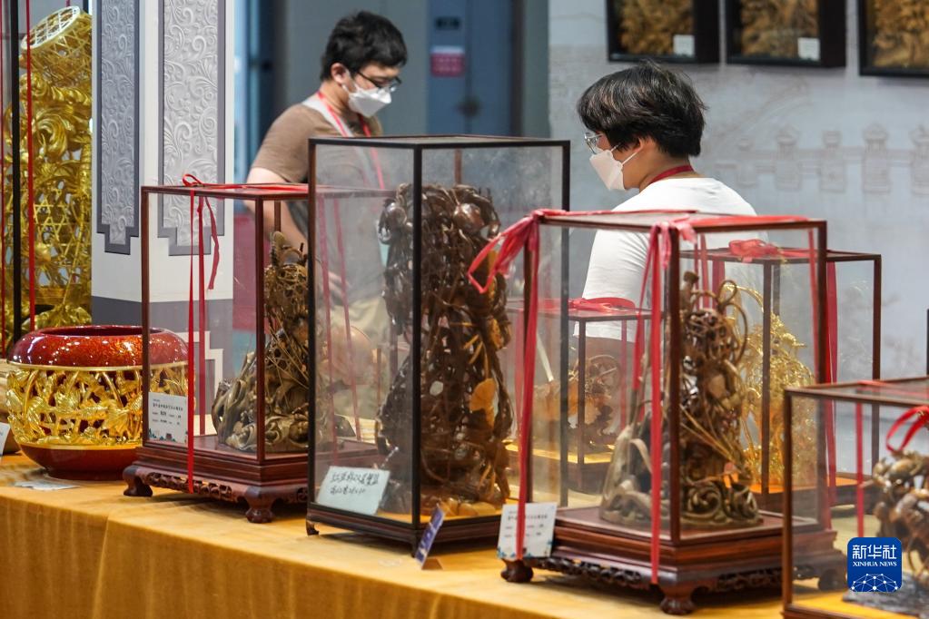 8月18日,觀(guān)眾在第二屆中國工藝美術(shù)博覽會(huì )參觀(guān)木雕藝術(shù)展品。