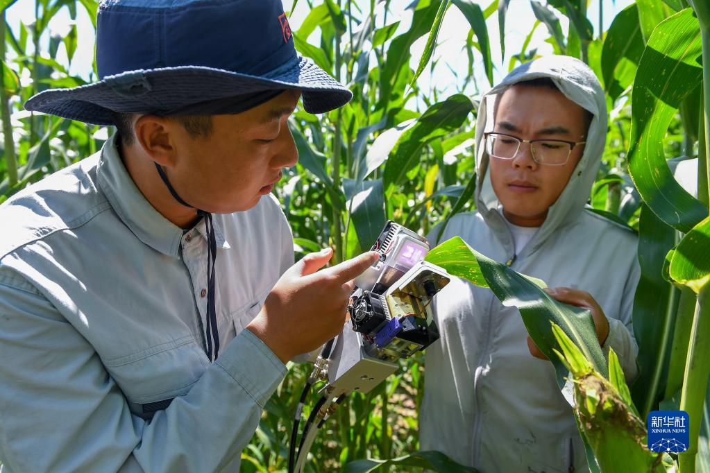 8月17日,沙野(右)和崔帥在試驗田里測量玉米光合作用。