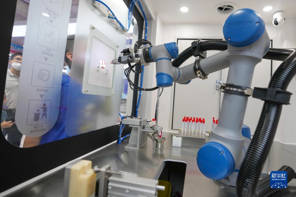 這是在2022世界機器人博覽會(huì )上拍攝的一款使用機器人進(jìn)行采樣的便民核酸采樣亭(8月18日攝)。