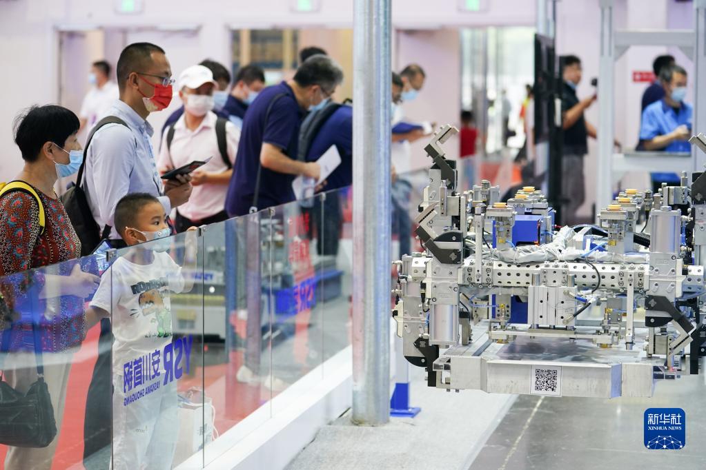 8月18日,一名小朋友在2022世界機器人博覽會(huì )上參觀(guān)一款新能源電池盒生產(chǎn)線(xiàn)展示。