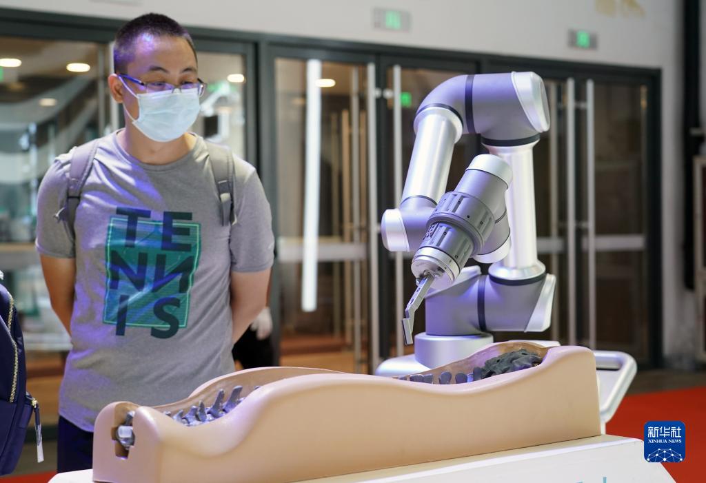 8月18日在2022世界機器人博覽會(huì )現場(chǎng)拍攝的骨科手術(shù)機器人。