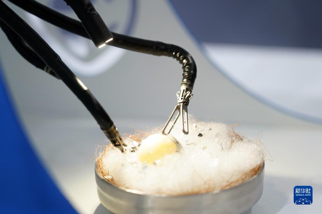 8月18日在2022世界機器人博覽會(huì )現場(chǎng)拍攝的單孔腔鏡手術(shù)機器人。