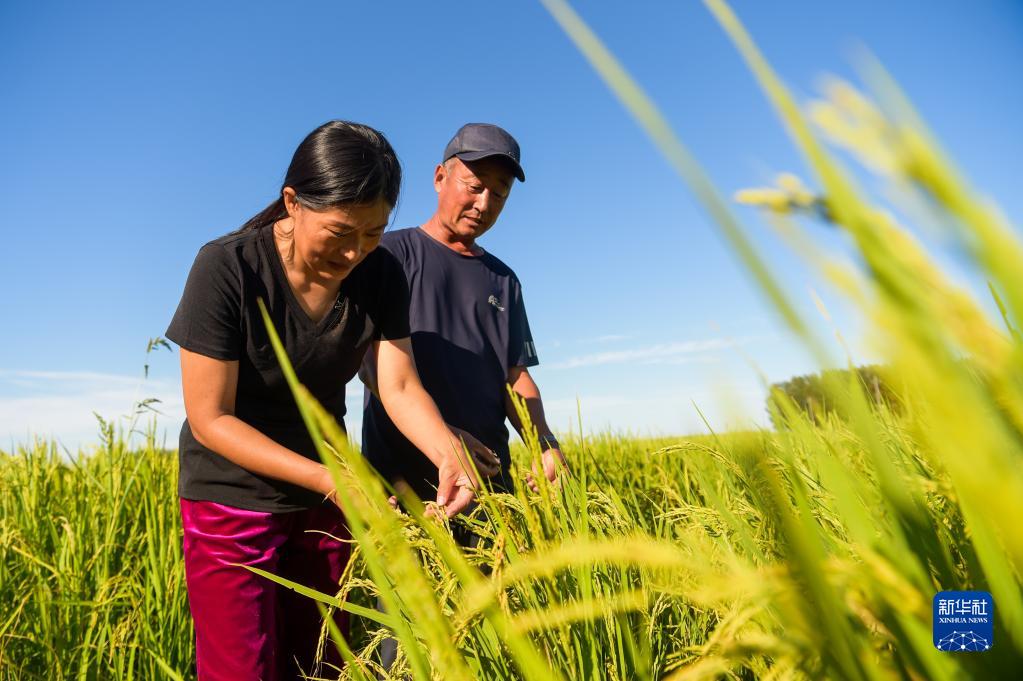 8月17日,在扎賚特旗先鋒村,宋春平(左)與水稻訂單種植戶(hù)查看水稻生長(cháng)情況。