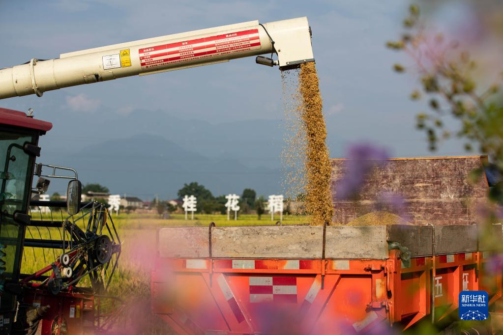 8月18日,在峨眉山市桂花橋鎮紅山村,工作人員操作機械收獲水稻。