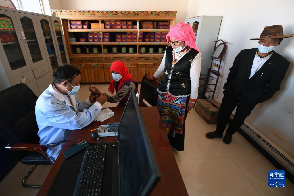 在治多縣索加鄉衛生院,布久索南更青(左一)為患者診療(8月11日攝)。