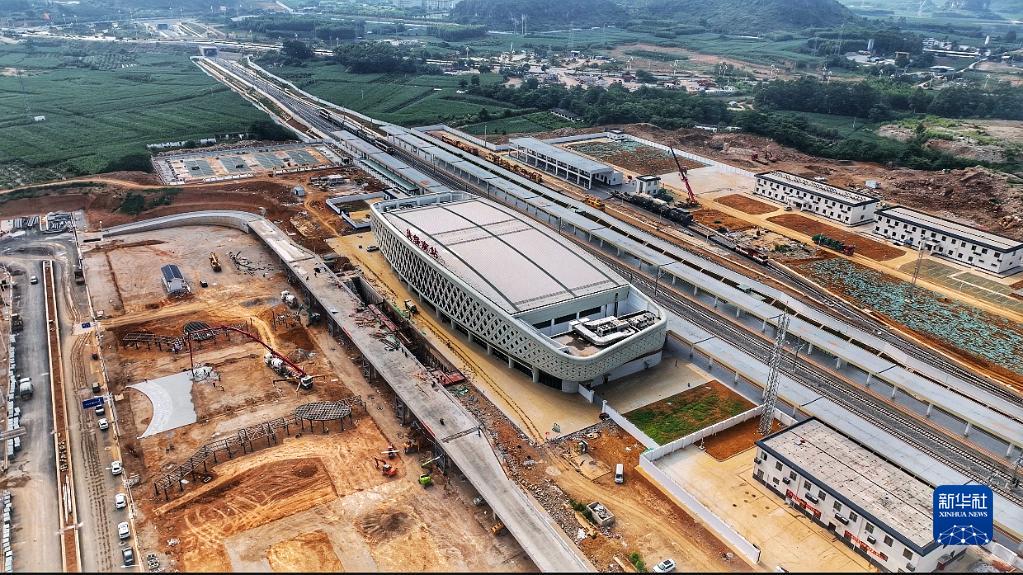 8月18日,南崇鐵路聯(lián)調聯(lián)試檢測車(chē)駛達扶綏南站(無(wú)人機照片)。