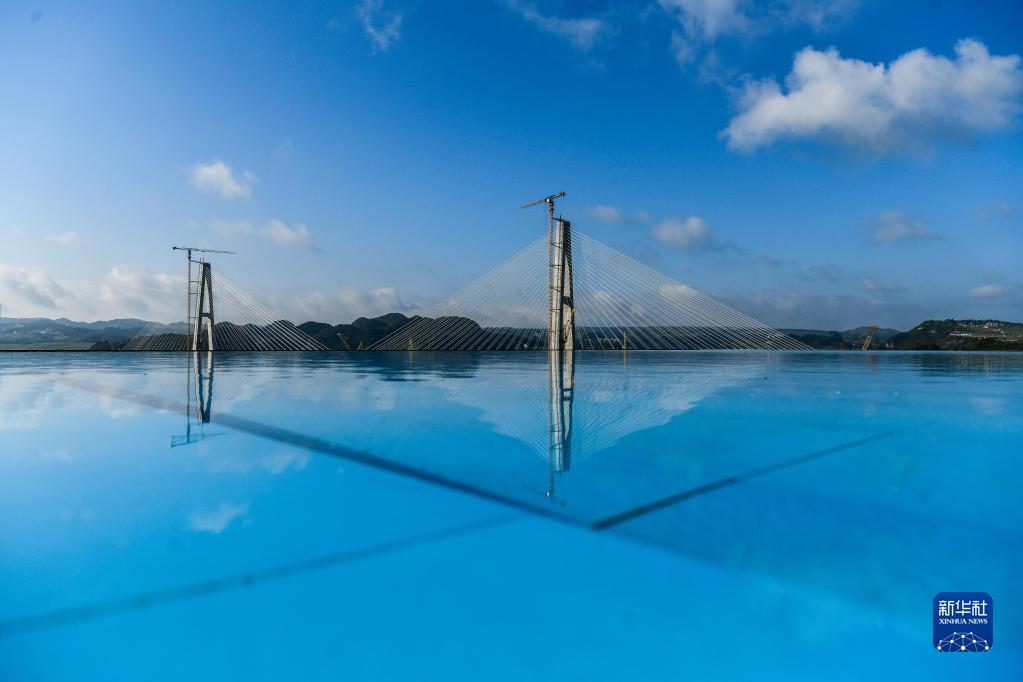 8月19日,貴州龍里河大橋倒映在一家酒店水池里。