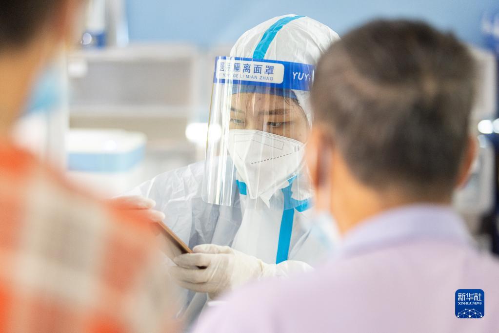 8月19日,醫護人員在浙江省湖州市第一人民醫院核酸檢測點(diǎn)為市民進(jìn)行資料錄入。