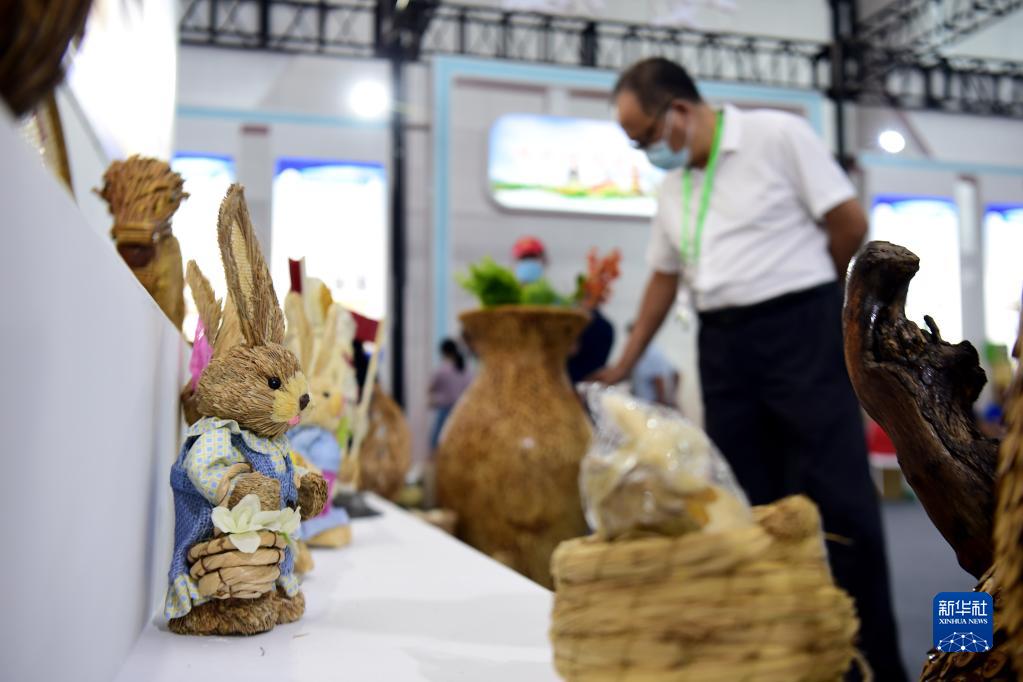 8月19日,與會(huì )者在2022安徽秸稈暨畜禽養殖廢棄物綜合利用產(chǎn)業(yè)博覽會(huì )上觀(guān)看用秸稈制作的工藝品。