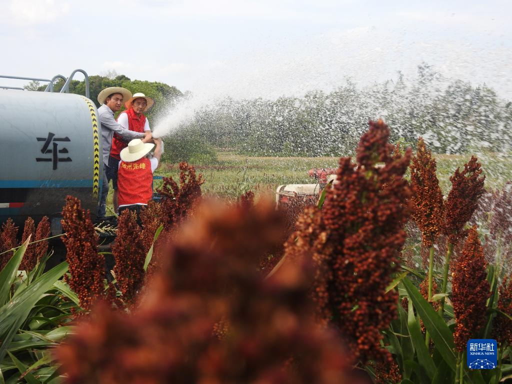 8月19日,在四川省達州市渠縣臨巴鎮四面村,基層黨員志愿者幫助村民灌溉大豆套種高粱地。