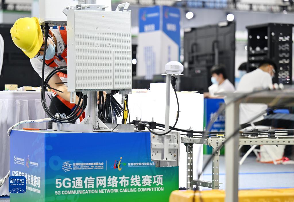 8月19日,首屆世界職業(yè)院校技能大賽的參賽選手在國家會(huì )展中心(天津)進(jìn)行5G通信網(wǎng)絡(luò )布線(xiàn)。