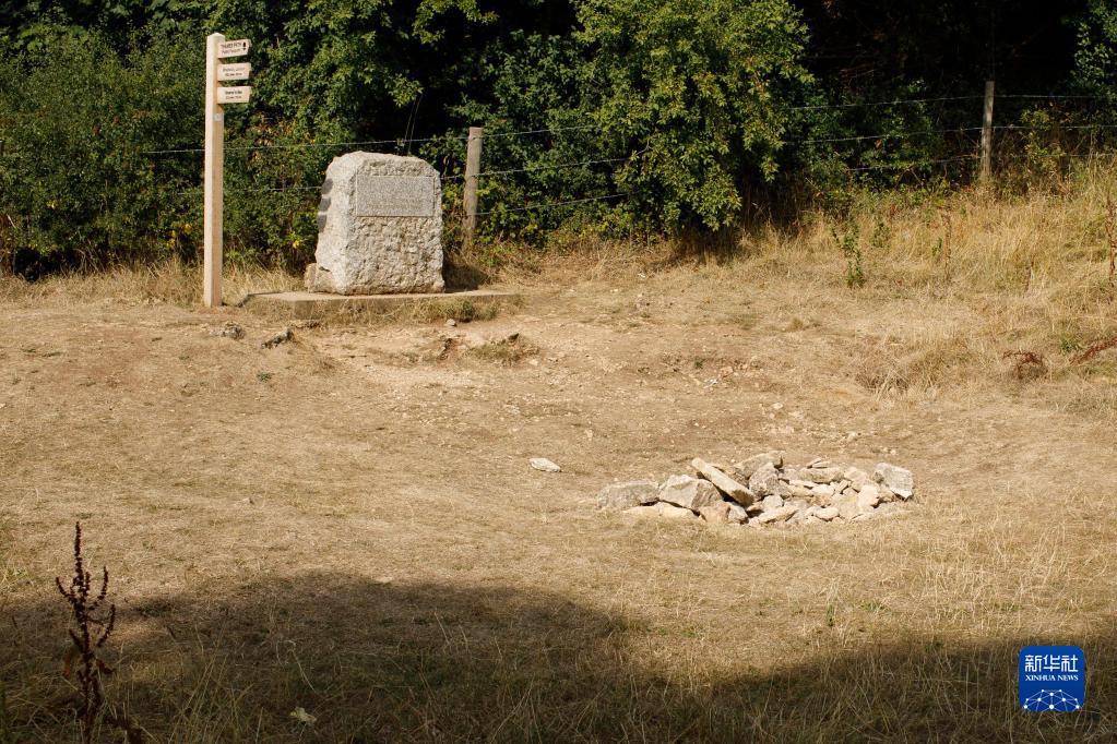 這是8月14日在英國賽倫塞斯特附近拍攝的干涸的泰晤士河發(fā)源地和一塊寫(xiě)有“泰晤士河起點(diǎn)”的石碑。