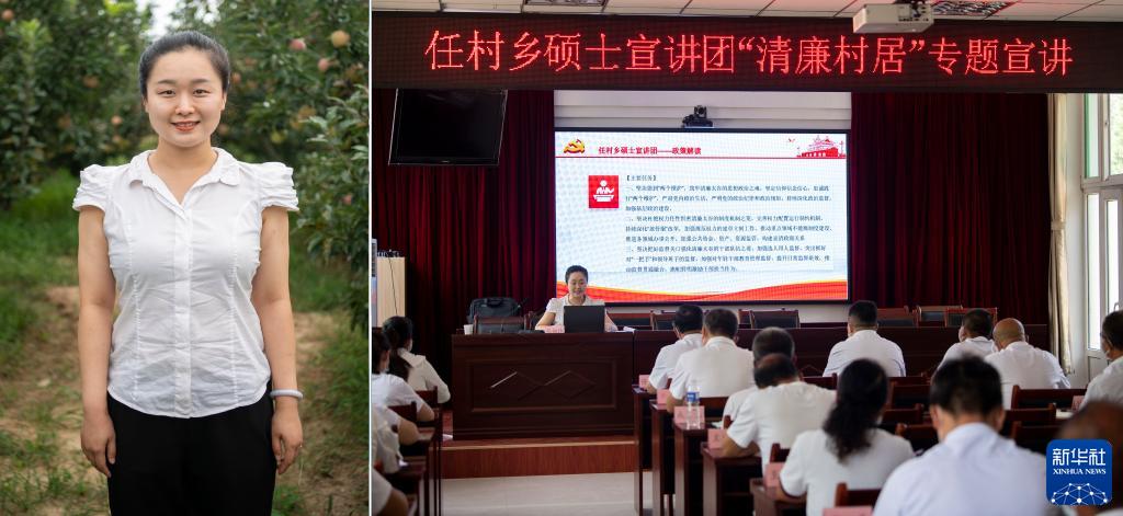 拼版照片:左圖為任村鄉碩士宣講團成員張婉玲;右圖為張婉玲在任村鄉進(jìn)行宣講(8月19日攝)。
