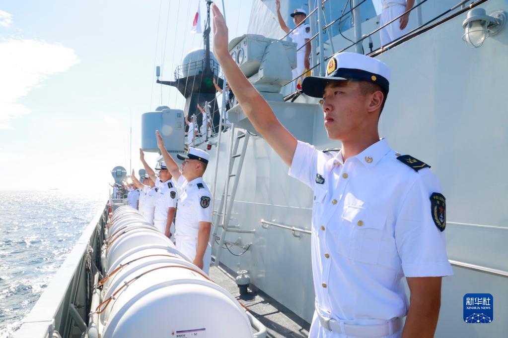 8月20日,“國際軍事比賽-2022”“海洋之杯”比賽在山東青島附近海域閉幕,中方官兵向俄方揮手告別。新華社發(fā)(袁波 攝)