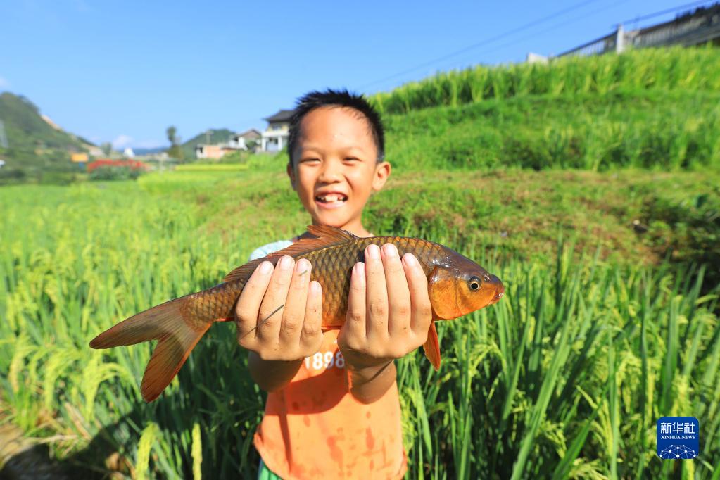 8月20日,貴州省丹寨縣高要村的一名小朋友展示從稻田里捉到的魚(yú)。