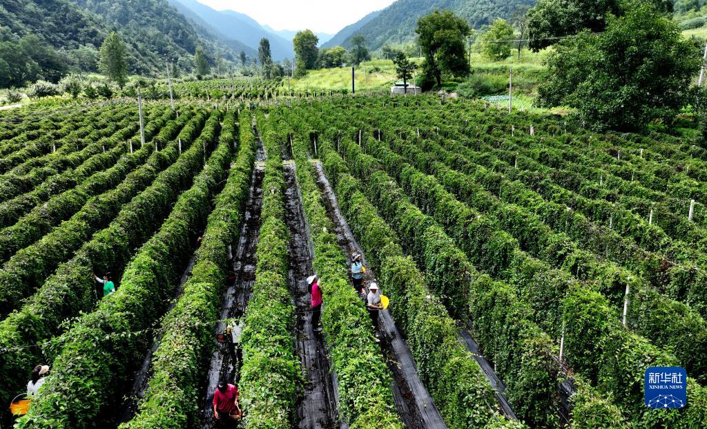 8月21日,洛南縣煜正中藥材專(zhuān)業(yè)合作社的員工在田間采摘五味子(無(wú)人機照片)。