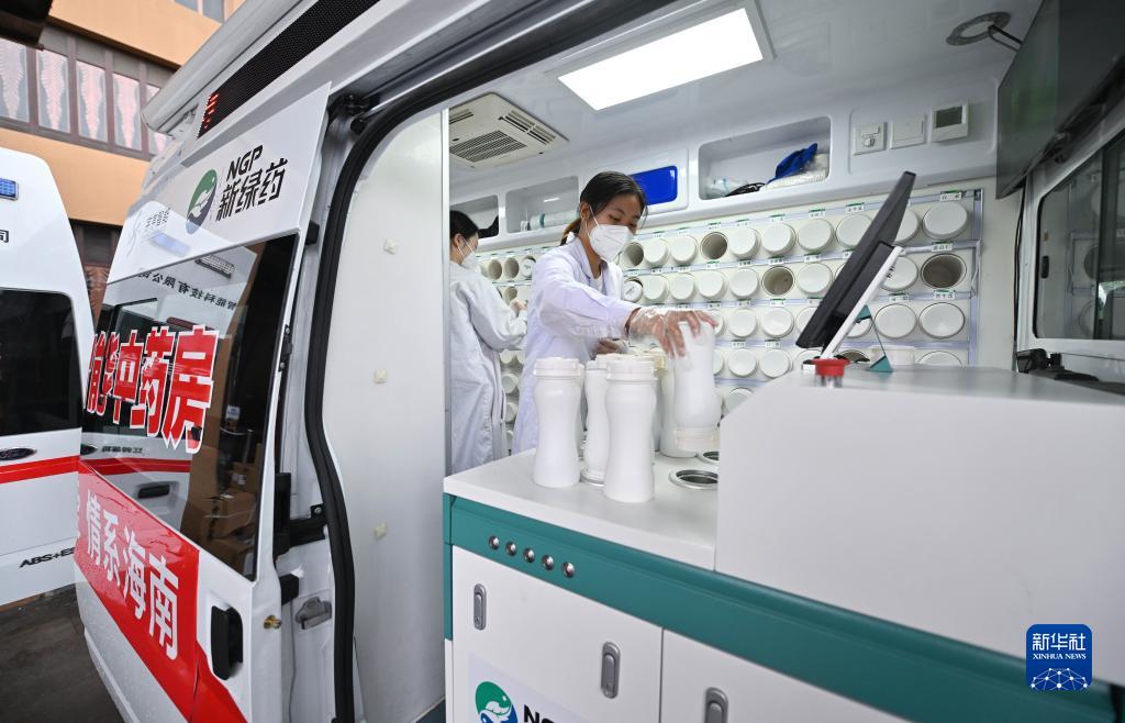 8月20日,在海南三亞一家酒店附近,工作人員在“流動(dòng)應急智能中藥房”里將盛有單味中藥濃縮顆粒的藥瓶放入發(fā)藥機。