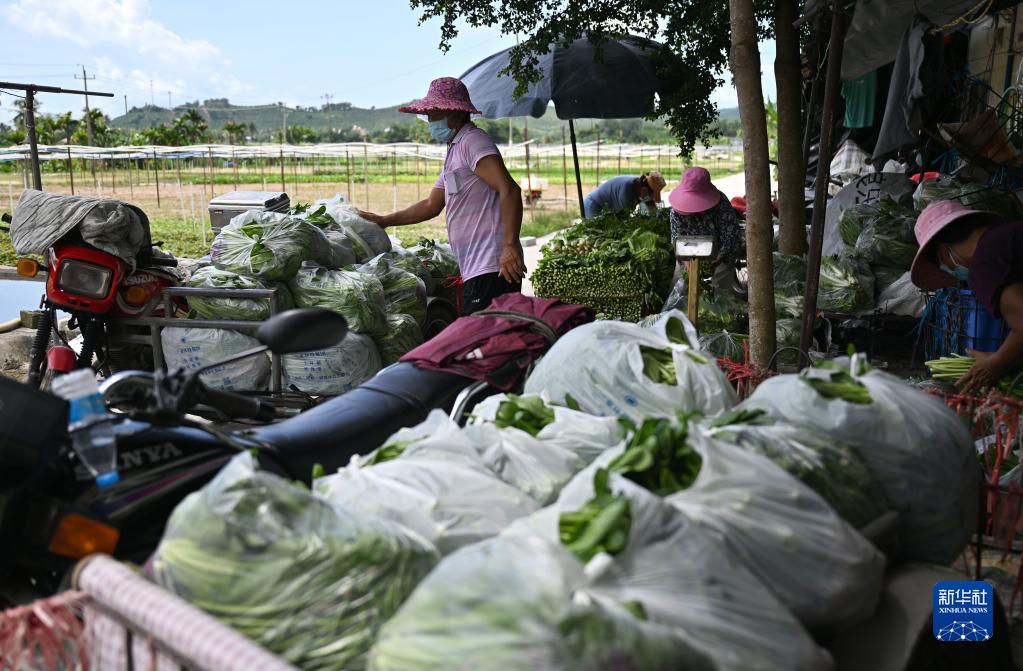 8月22日,三亞市三川葉菜產(chǎn)銷(xiāo)農民專(zhuān)業(yè)合作社的農民將打包好的蔬菜裝車(chē)。