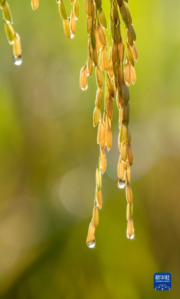 8月20日,在貴州省黔東南苗族侗族自治州從江縣剛邊壯族鄉良田村,顆粒飽滿(mǎn)的稻穗上掛著(zhù)露珠。