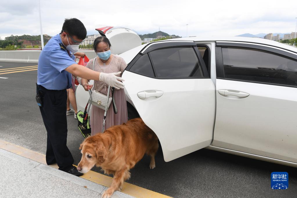 8月19日,在河源東站,客運員張金宇(左)在進(jìn)站口接到了張莉和她的導盲犬滿(mǎn)悅。