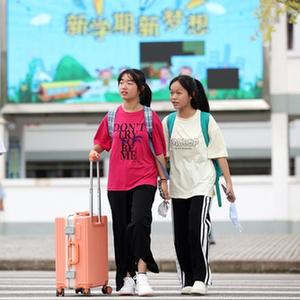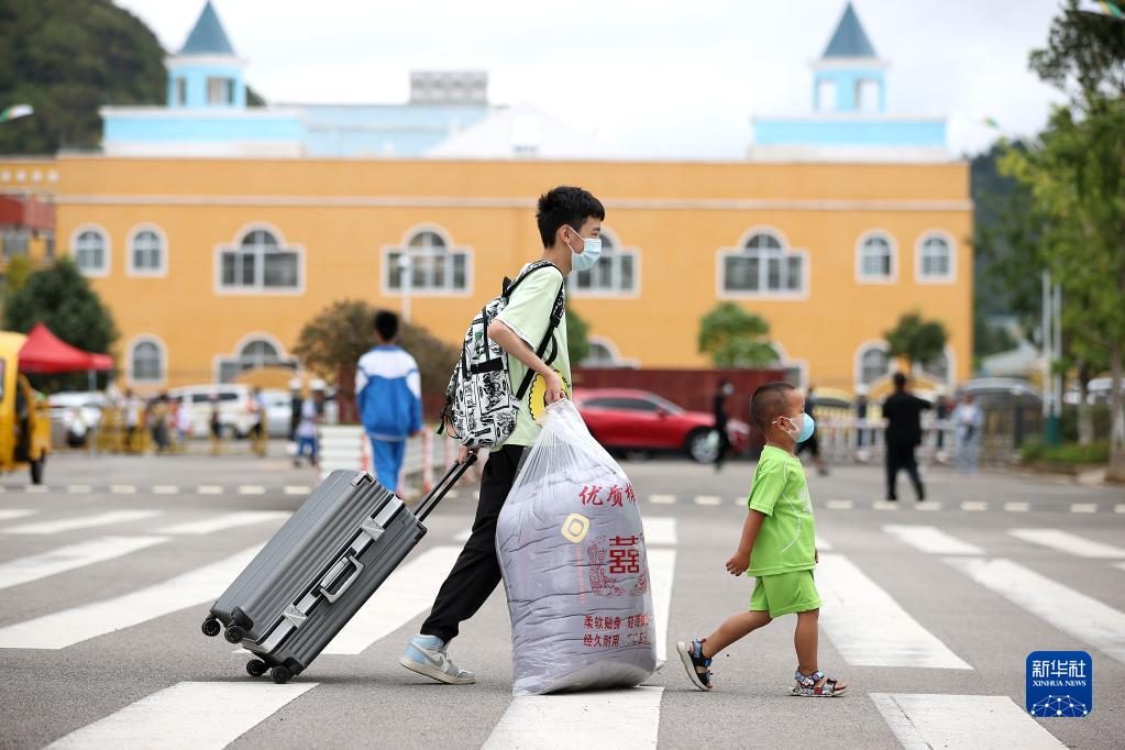 8月22日,在貴州省黔東南苗族侗族自治州丹寨縣第二中學(xué),初一年級新生(左)在弟弟的陪伴下前往報到處。