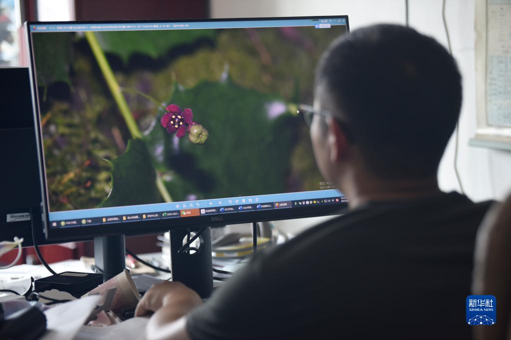 胡君在辦公室查看尖齒衛矛花和果實(shí)的照片(8月17日攝)。新華社記者 劉坤 攝