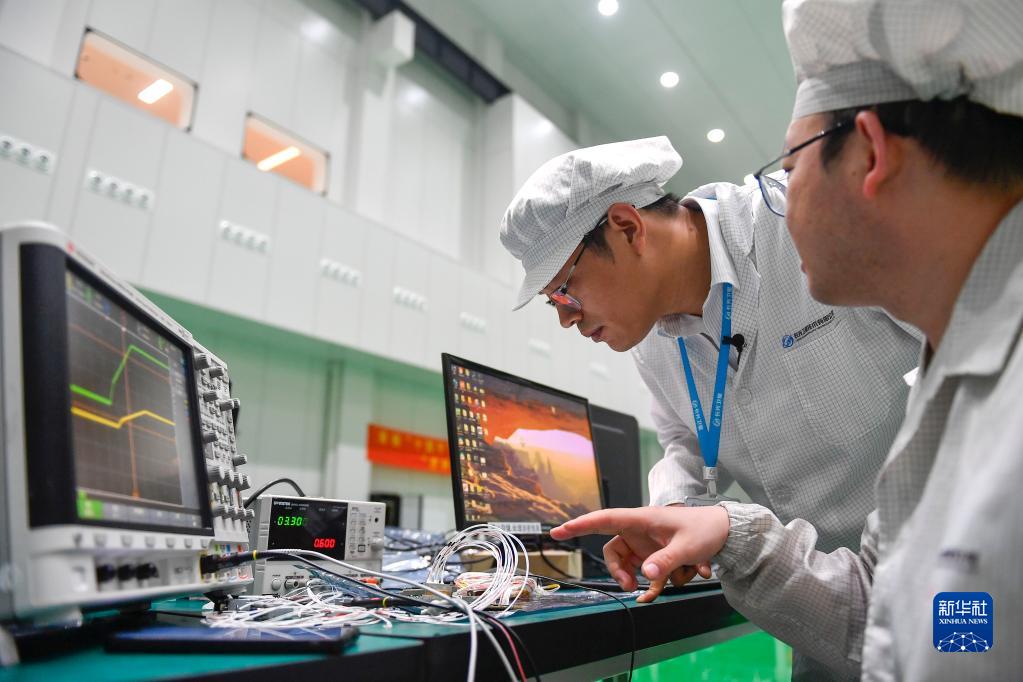 在長(cháng)光衛星技術(shù)股份有限公司總裝車(chē)間,項目總師陳茂勝(左)觀(guān)察衛星組件的調試參數(2022年8月3日攝)。