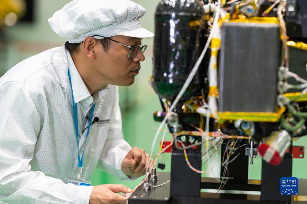 2022年8月3日,在長(cháng)光衛星技術(shù)股份有限公司總裝車(chē)間,項目總師陳茂勝踏查“吉林一號”高分03衛星生產(chǎn)工作。
