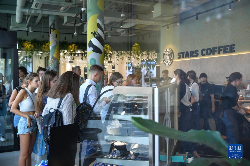 8月22日,人們在俄羅斯莫斯科一家“星咖啡”門(mén)店排隊點(diǎn)餐。