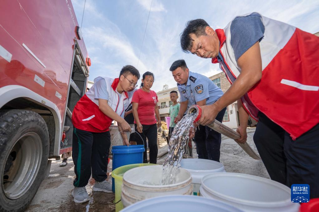 8月23日,在貴州省銅仁市萬(wàn)山區魚(yú)塘鄉高峰村,志愿者給村民送水。