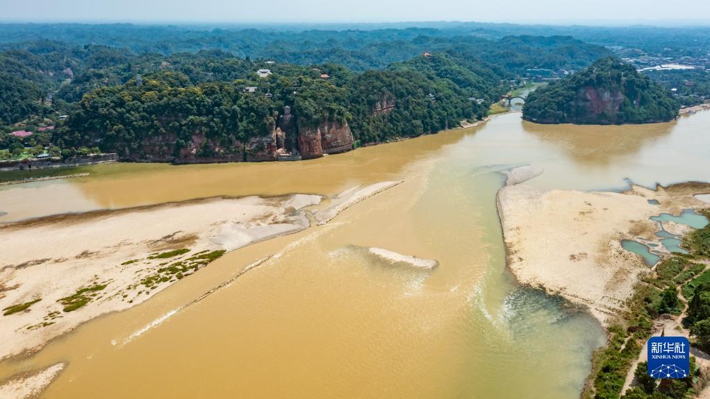樂(lè )山大佛前方的三江匯流處水位持續降低,部分河床與江灘裸露,樂(lè )山大佛露出底座(8月23日攝,無(wú)人機照片)。