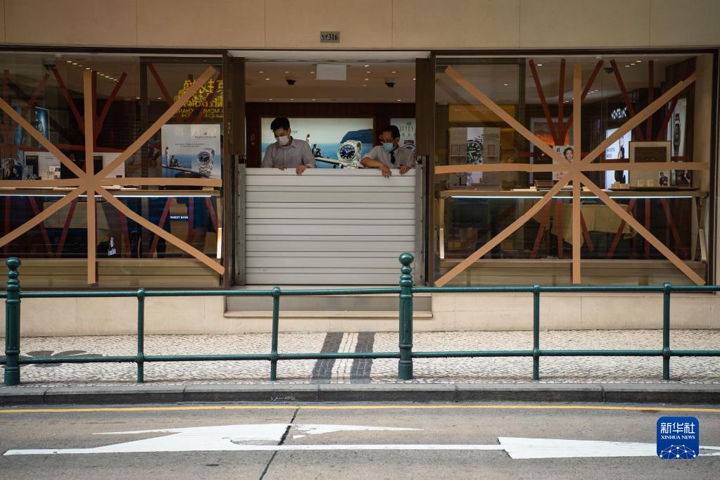 8月24日,澳門(mén)新馬路一家商戶(hù)工作人員在加裝防水閘。