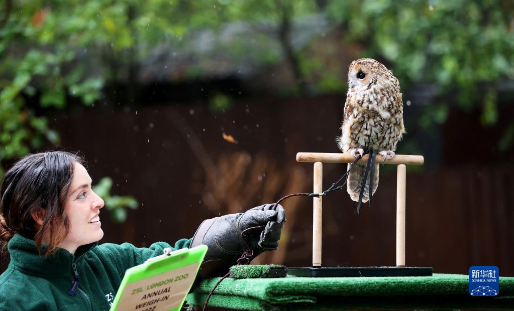 8月25日,在英國倫敦動(dòng)物園,工作人員為一只貓頭鷹稱(chēng)重。