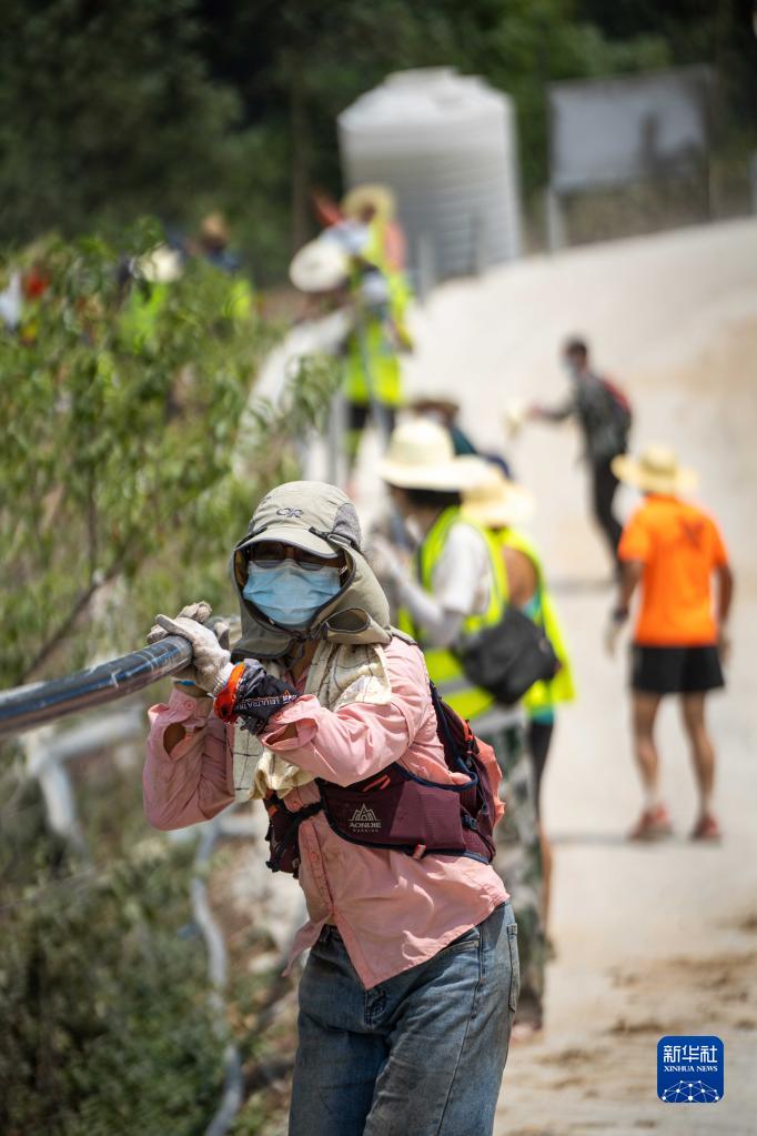8月26日,為防止附近山火復燃,志愿者在鋪設輸水管道。