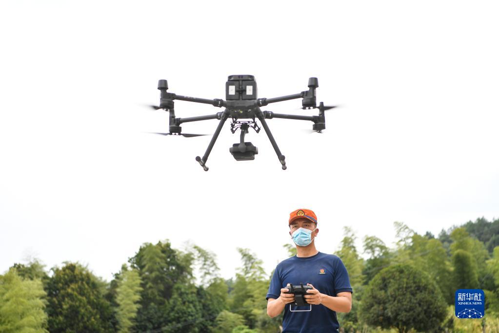 8月26日,消防人員準備利用無(wú)人機巡查北碚區與璧山區交界一帶山林情況。