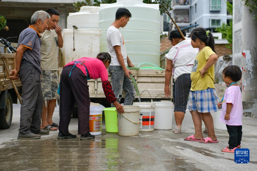 8月26日,在銅仁市沿河縣譙家鎮,志愿者在給用水困難的村民送水。