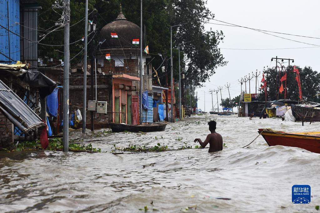 8月21日,在印度北方邦普拉亞格拉杰,一名船夫在洪水中拉著(zhù)自己的船。近日,印度北方邦持續遭洪水侵襲。印度每年6月至9月是季風(fēng)雨季,雷電暴雨天氣頻發(fā),洪水、泥石流、山體滑坡等災害經(jīng)常發(fā)生。新華社發(fā)