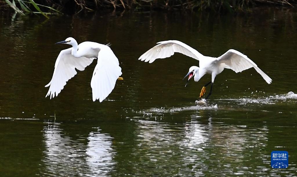 8月27日,白鷺在山東省滕州市的荊河上嬉戲。