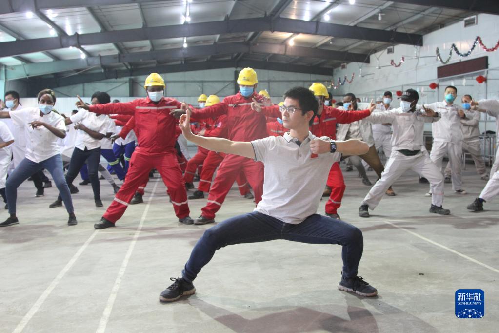 8月26日,在津巴布韋旺吉電站,醫療隊隊員帶領(lǐng)中企員工和當地居民學(xué)習中國傳統健身體操八段錦。