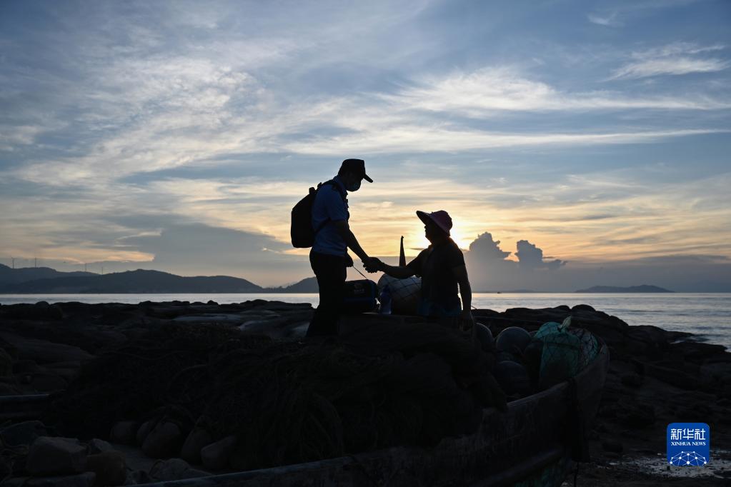 8月23日,在莆田市秀嶼區埭頭鎮黃瓜村,漁民主動(dòng)與許偉偉(左)握手。在黃瓜島,許偉偉對村民來(lái)說(shuō)如同家人一樣,他們每次見(jiàn)到許偉偉,都會(huì )向他打招呼。