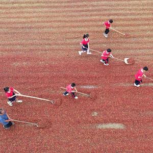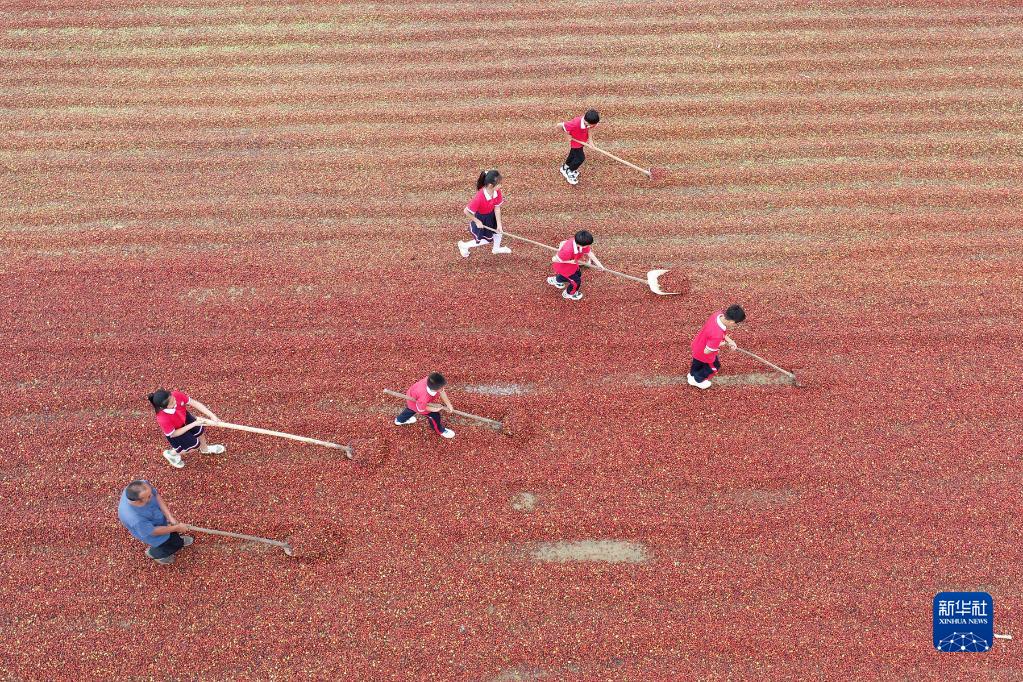 8月27日,河北省邢臺市內丘縣柳林鎮明德小學(xué)學(xué)生在體驗晾曬酸棗(無(wú)人機照片)。