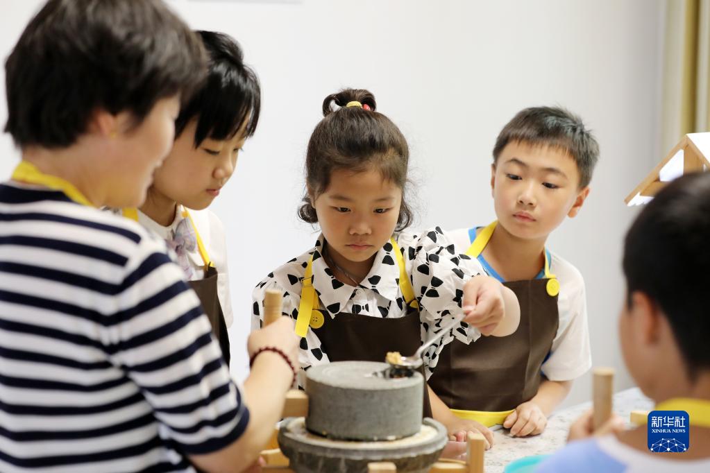 8月27日,在山東省臨沂市郯城縣郯城街道龍泉社區黨群服務(wù)中心,社區居民教孩子們使用石磨。