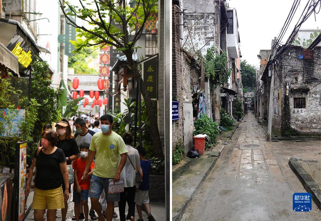 這是一張拼版照片:左圖為2022年7月19日拍攝的廣州永慶坊永慶大街(新華社記者 鄧華 攝);右圖為2015年拍攝的廣州永慶坊永慶大街(廣州市荔灣區住房建設和園林局供圖)。