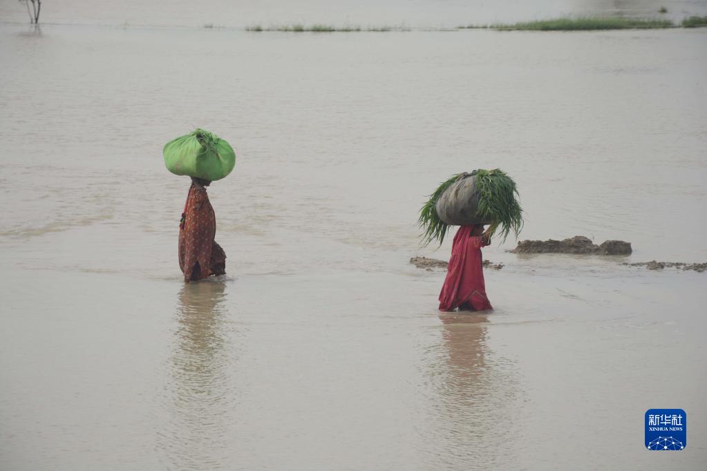 8月27日,人們在巴基斯坦拉金布爾涉水出行。