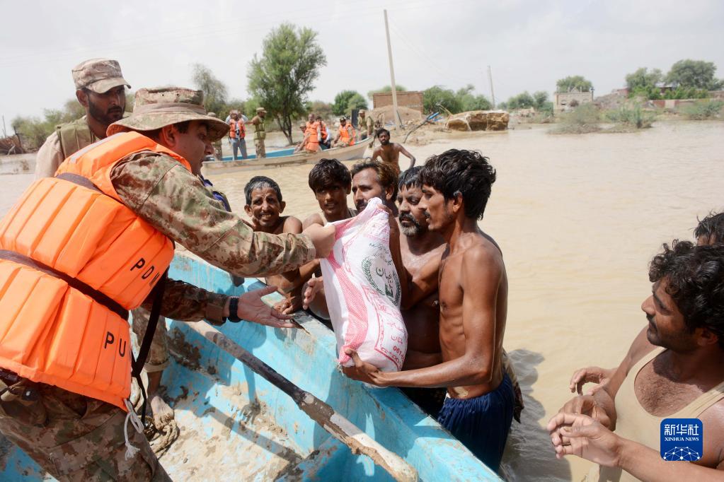 8月27日,在巴基斯坦拉金布爾,巴基斯坦軍人向受災民眾發(fā)放物資。