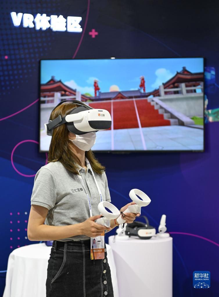 8月28日,在國家會(huì )展中心(天津),參會(huì )者在2022年中國網(wǎng)絡(luò )文明大會(huì )展區內體驗VR設備。