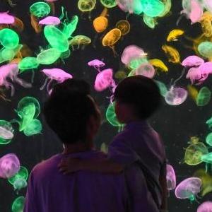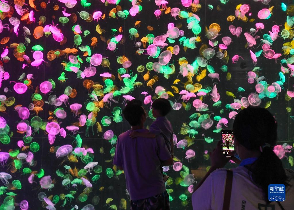 夜宿在珠海長(cháng)隆海洋王國鯨鯊館的體驗者夜游海洋王國(8月27日攝)。
