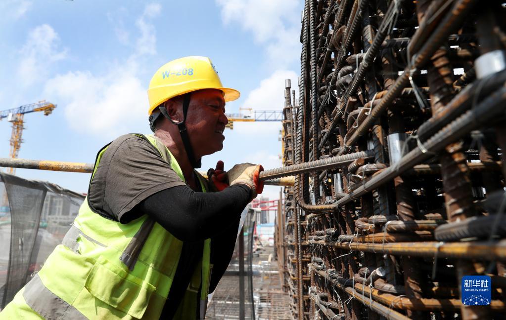 8月29日,工人在臨港西島金融中心項目工地上進(jìn)行塔樓剪力墻鋼筋綁扎作業(yè)。